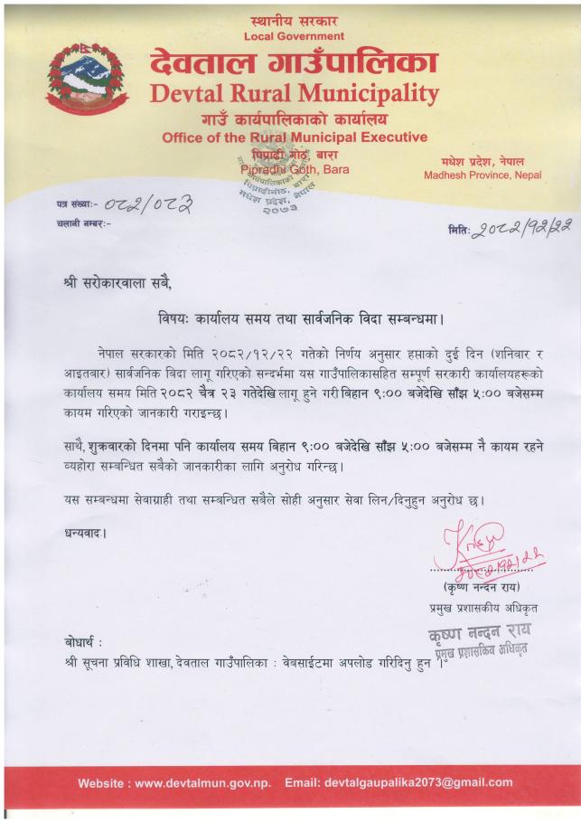 » कार्यालय समय तथा सार्वजनिक विदा सम्बन्धमा।