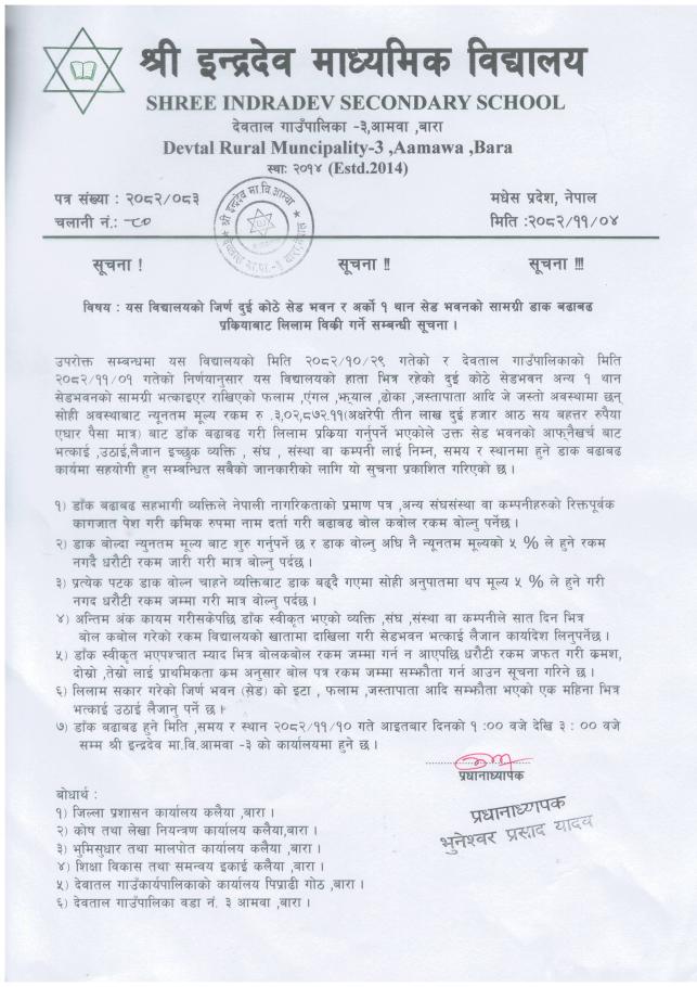 » जिर्ण भवनको सामाग्रीको डाक बढाबढ प्रक्रियाबाट लिलाम विक्रि गर्ने सम्बन्धी इन्द्रदेव माध्यमिक विद्यालय आम्वाको सूचना।