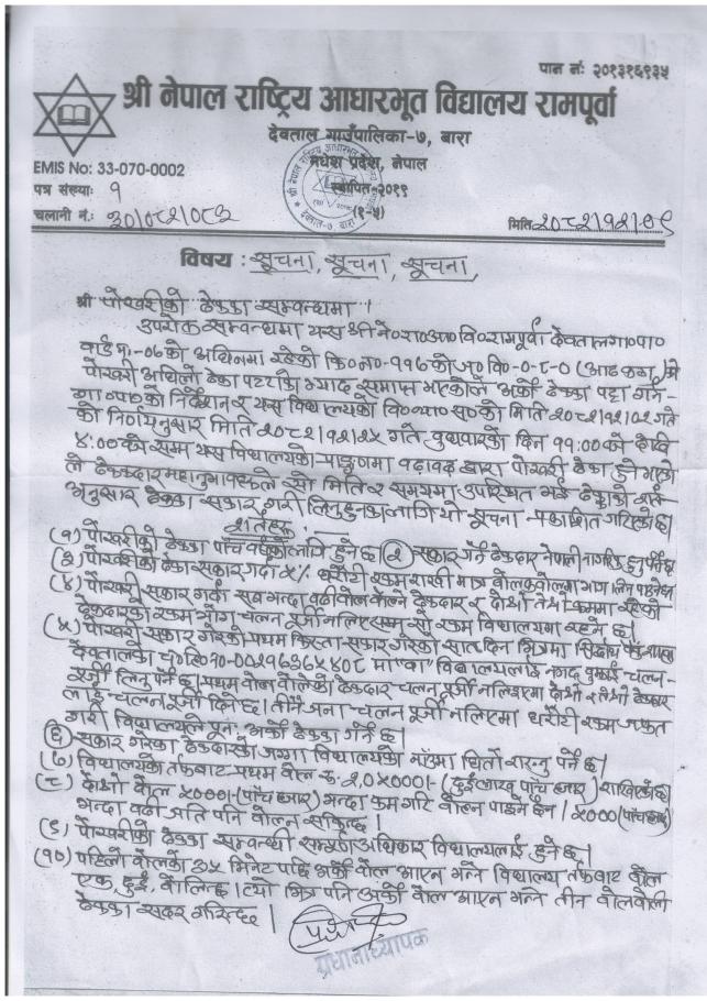 » श्री ने.रा.आ.वि. राम्पूर्वाको पोखरीको ठेक्का सम्बन्धी सूचना।