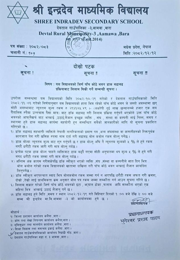 जिर्ण भवनको सामाग्रीको डाक बढाबढ प्रक्रियाबाट लिलाम विक्रि गर्ने सम्बन्धी इन्द्रदेव माध्यमिक विद्यालय आम्वाको सूचना।