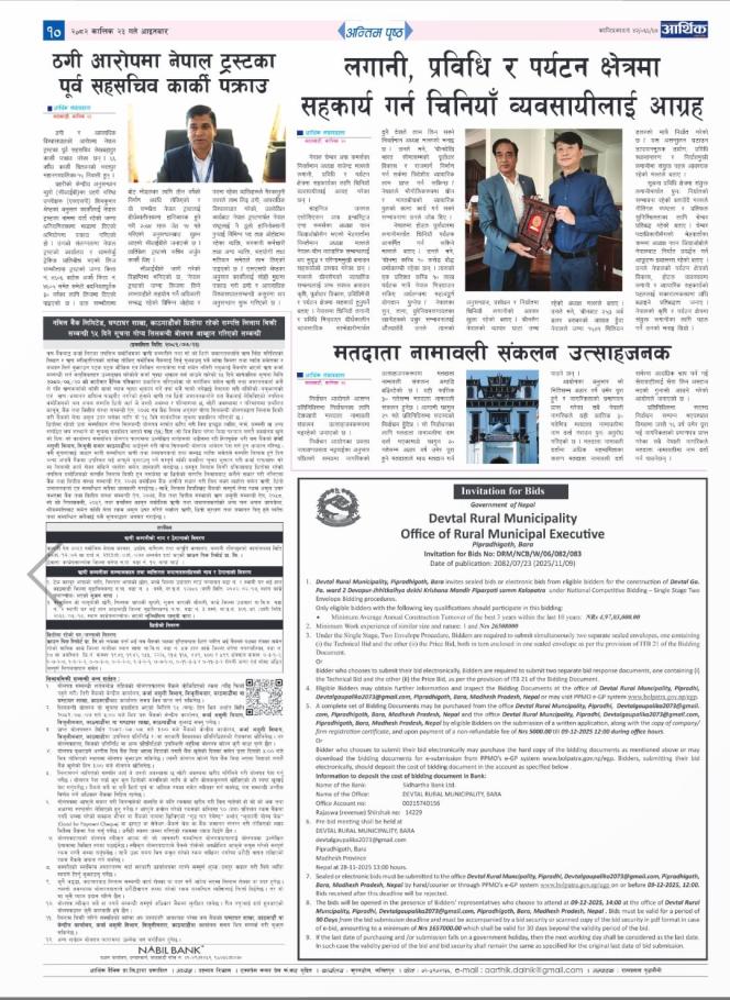 » देवताल गा.पा.-२ देवापुर झिटकैया देखि कृ्ष्णा मन्दिर पिपरपाती सम्म कालोपत्रे निर्माणको कार्यको लागि विधुतिय बोलपत्र आह्वान गरिएको सूचना ।